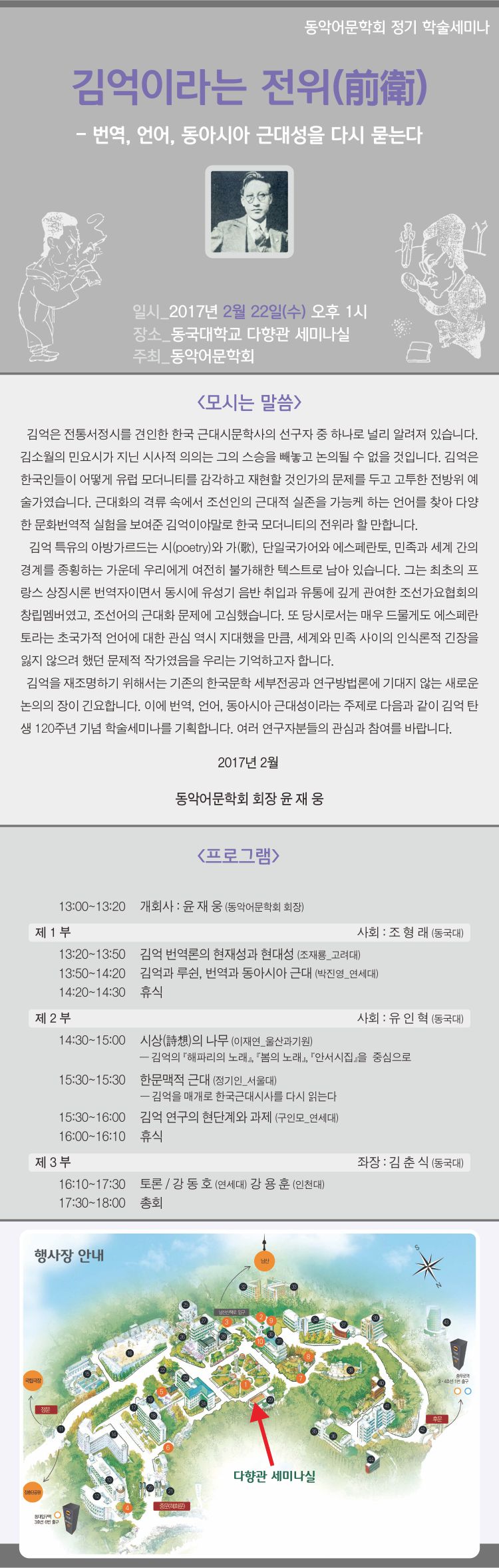 김억을재조명하기위해서는기존의한국문학세부전공과연구방법론에기대지않는새로운논의의장이긴요합니다. 이에번역, 언어, 동아시아근대성이라는주제로다음과같이김억탄생120주년기념학술세미나를기획합니다. 여러연구자분들의관심과참여를바랍니다.